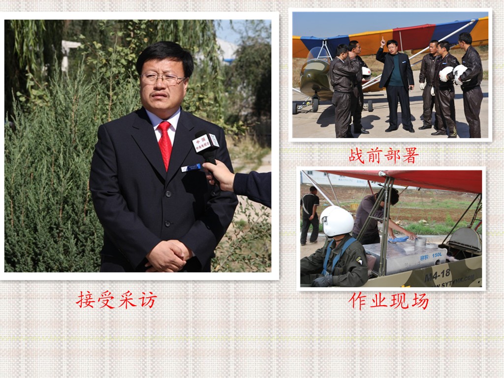 ,而是毅然決然的走上里一條充滿艱辛的打拼之路,在別人笑之為天方夜譚的情況下,1999年四處投親靠友籌集資金從北京航空航天大學購進了一架蜜蜂4超輕型飛機,與此同時它成就了內蒙古自治區第一個私人擁有飛機的人,飛機有了,他東奔西走,開始學習、探索、研究制作超輕飛機飛機播種和飛機滅蟲設備,經過4年的反復試驗,終于在2003年設備試驗成功,但沒有相關手續私人飛機不允許私自飛行,于是成立航空公司的想法在心中勾畫,他開始了中國第一家超輕型飛機通用航空公司的籌建工作,一己之力不可成江河,于是他伙同一直支持他的妻子四處請專家、找能人,終于在2006年經過三年努力國家民航華北地區管理局為其頒發了通用航空公司籌建許可證,于是他又四處籌措資金,投入到籌建工作之中,2008年六月經民航華北地區管理局驗收合格并頒發通用航空運營許可,與此同時他的飛機播種、飛防滅蟲兩項實用新型專利獲得通過,國家知識產權局頒發了實用新型知識產權證書。(鏡頭七)設備特寫(包括專利證書)邱志剛一個不屈不撓的東北漢子,在平凡的人生道路上創造了不平凡的業績,創造了不平凡的人生價值。創造了人生的豪邁與神奇。
