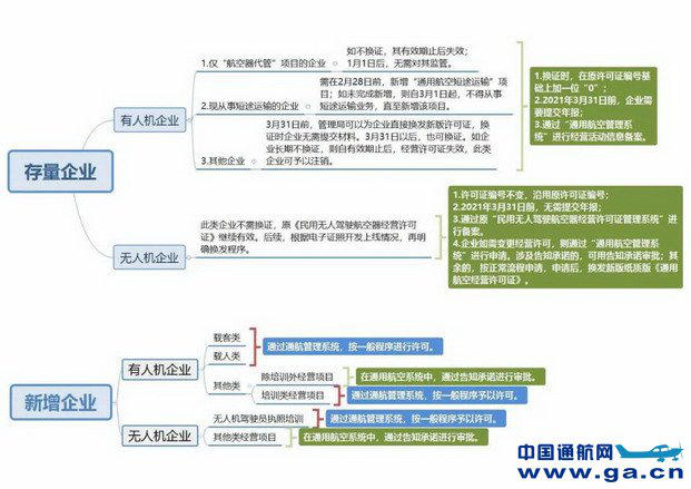 2.存量無人機企業(yè)。已于2020年12月31日(含)前 取得《民用無人駕駛航空器經營許可證》的企業(yè)暫無需申領 新版《通用航空經營許可證》,在新版許可證電子證照上線 并完成證照換發(fā)前,其《民用無人駕駛航空器經營許可證》 持續(xù)有效。